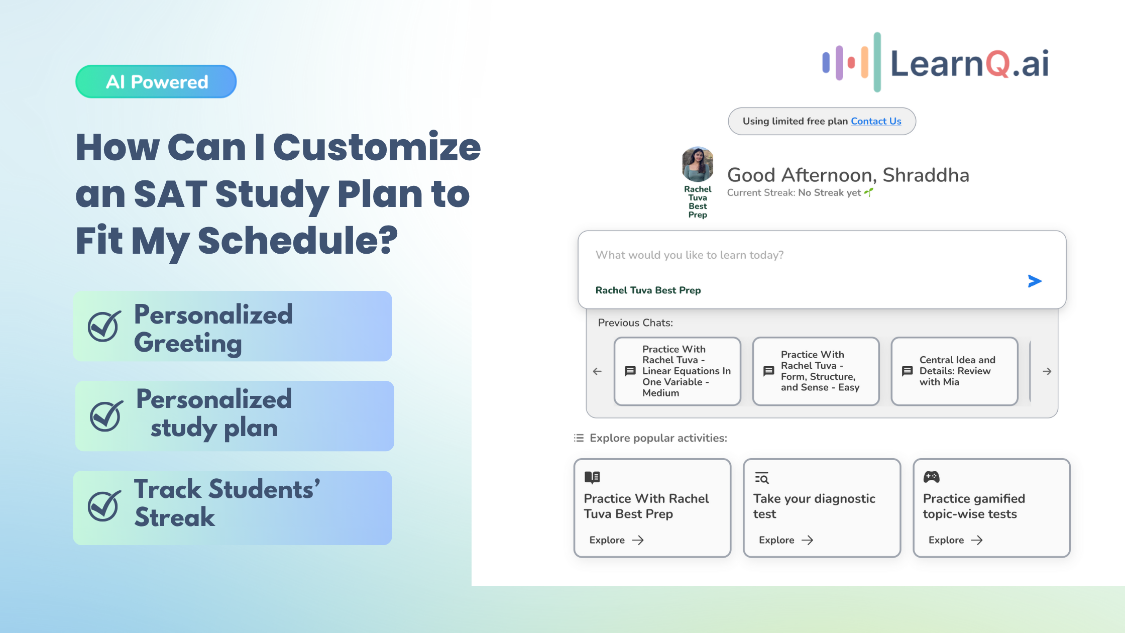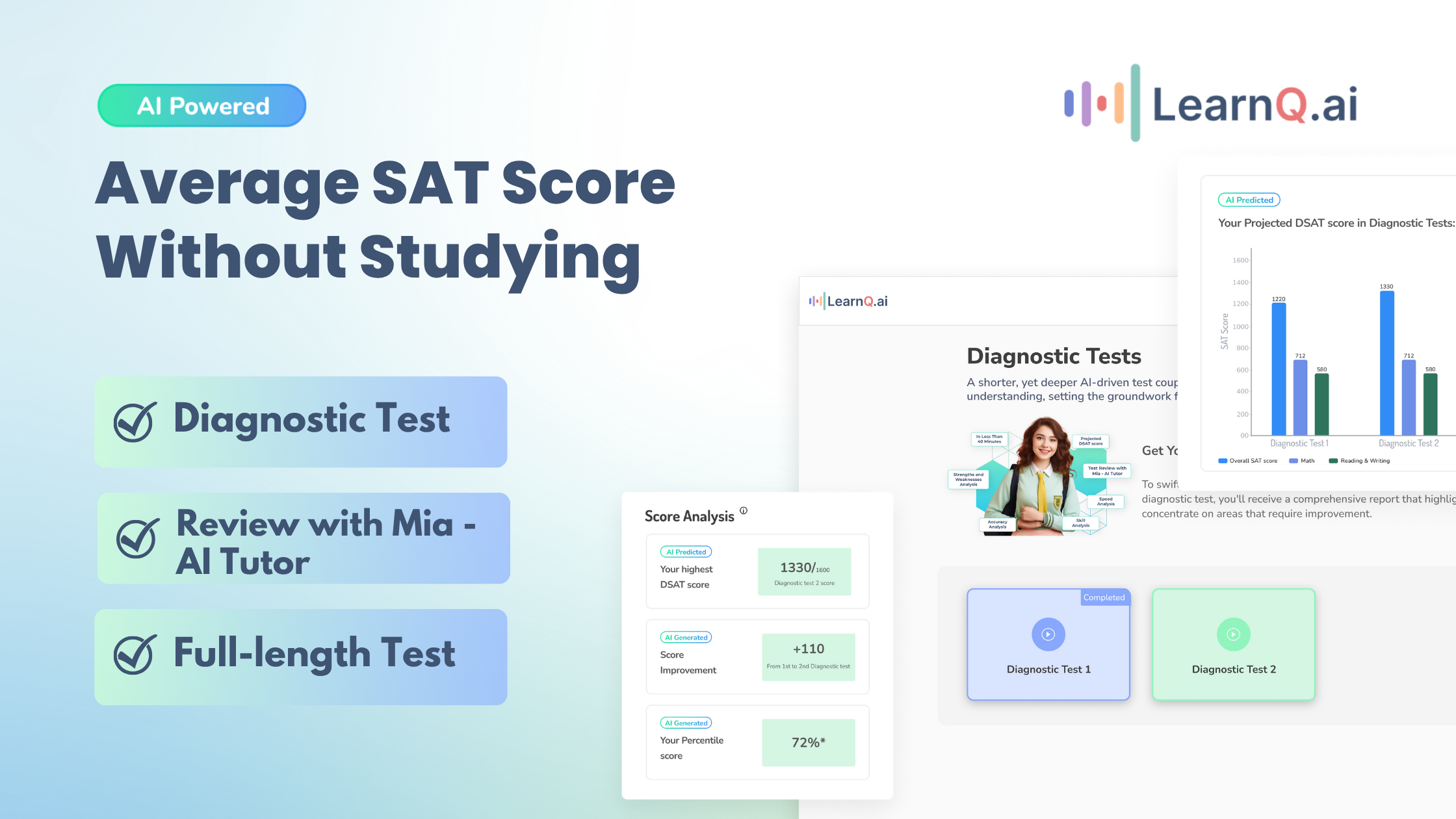 With tools like LearnQ.ai, you can optimize your preparation by focusing on weaker areas, tracking progress, and receiving personalized feedback. This approach helps you practice smarter, master concepts faster, and ultimately improve your SAT performance.